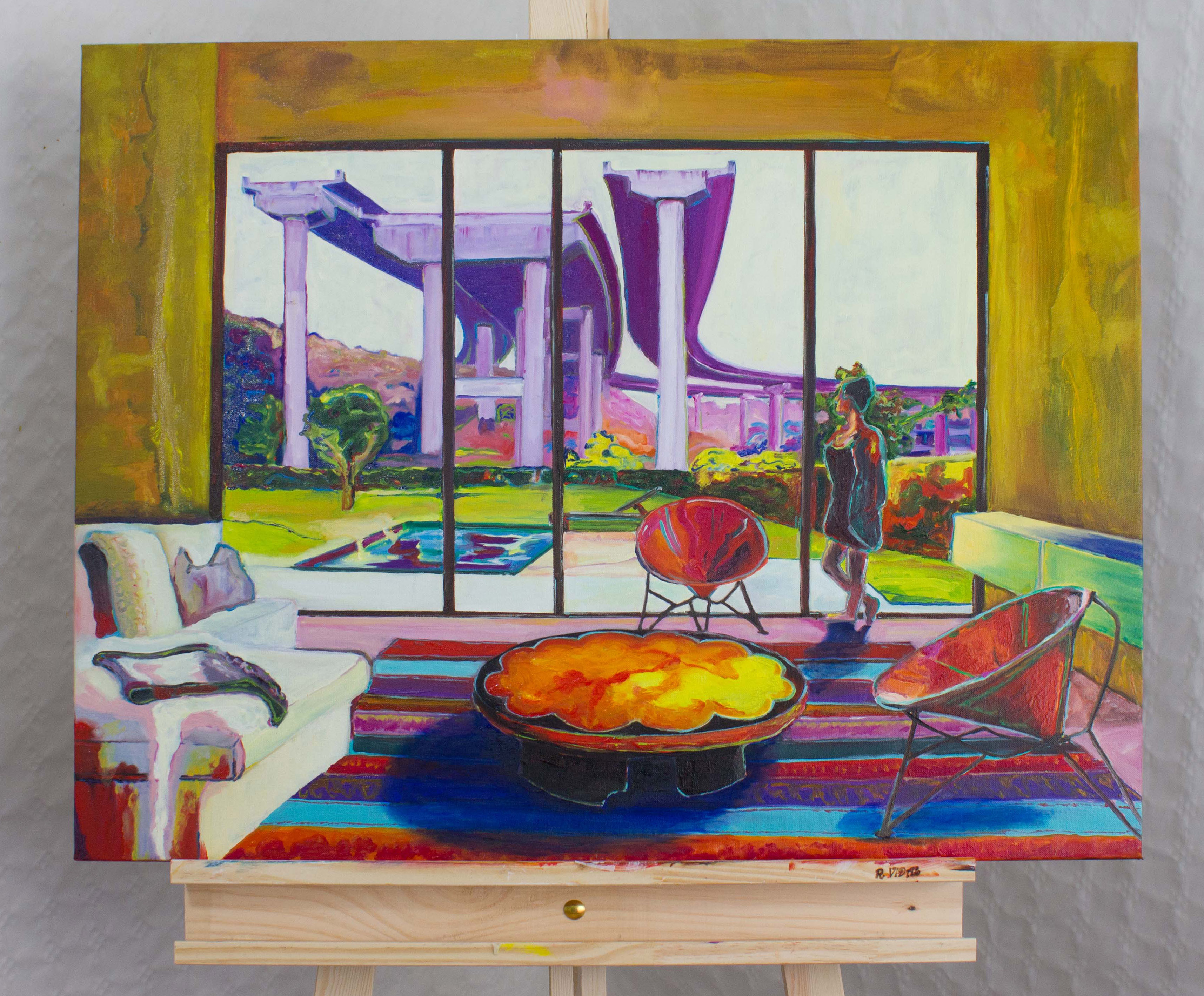 I work mainly with oil paint. My paintings are made up of several layers, which creates depth and allows the colours to become more intense. This powerful use of colour is one of the most striking features of my work. It also creates an estrangement of the image. Both elements contribute to my own style.